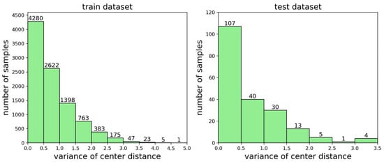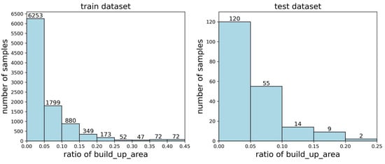 There are significant differences in samples from different urban areas, which can be intuitively reflected in the proportion and concentration of built-up areas. In this paper, a histogram of the number of samples with different proportions of built-up areas (i.e., first feature) was presented in the dataset, as shown in Figure 3. In addition, the variance in the centroid distance of the built-up areas (i.e., second feature) was calculated for each sample, and it was normalized accordingly, which could reflect the degree of concentration of urban development. A histogram of the number of urban samples representing different variances in the centroid distance in the built-up area of the dataset is shown in Figure 4.