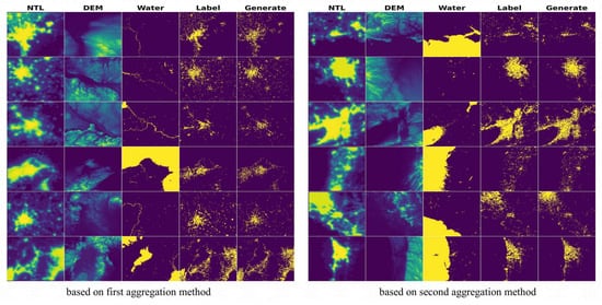 Figure 5 shows some generation targets (as Generate) and corresponding labels, where the parameter w of the sampling process was fixed to 0.1. Each row of the left figure and right figure represents a different urban area. The first three columns are NTL images, DEM images, and water area images of urban areas. The fourth column is the real built-up area images of the urban areas. The fifth column of the left figure is the prediction results obtained based on the first aggregation method. The fifth column of the right figure is the prediction results based on the second aggregation method. The closer the images in the fourth column are to the images in the fifth column, the more accurate the predictions in this paper.