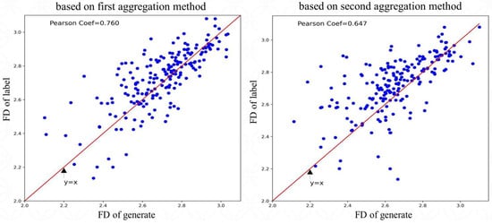 To verify whether the spatial morphological features of the generation targets (as Generate) were similar to the corresponding labels, the fractal dimension was used for verification. The fractal dimensions of each generation target (the parameter w of the sampling process was fixed to 0.1) and the corresponding label were calculated separately. Then, the Pearson correlation coefficient of the two fractal dimensions was calculated, as shown in Figure 6. The Pearson correlation coefficient for the first aggregation method of the guidance condition was 0.760. The Pearson correlation coefficient for the second aggregation method of the guidance condition was 0.647. This suggests that constructing a guidance condition by stacking images representing multiple attributes by channels allowed the conditional diffusion model to learn spatial morphological feature more accurately.