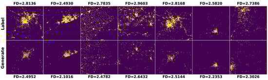 The differences between the fractal dimensions of the generation targets and the fractal dimensions of the corresponding labels were calculated. The five segments 0–0.1, 0.1–0.2, 0.2–0.3, 0.3–0.4, and >0.4 were divided at intervals of 0.1. Within each segment, the number of samples, the average fractal dimension of the generation targets, the average fractal dimension of the labels, and the average proportion of built-up areas of the labels were counted separately. The statistical results are shown in Table 4 and Table 5.