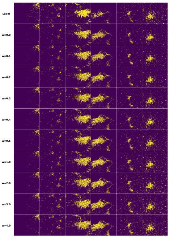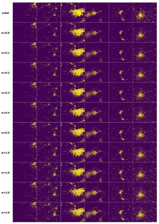 The use of the same parameter w allowed a fair comparison of two types of aggregation methods on the generation targets. By comparing Table 6 and Table 7, it can be seen that the targets generated based on the first aggregation method were always better for the three metrics of SSIM, LPIPS, and spatial morphological features. Therefore, stacking images representing multi-source attributes by channel enabled the conditional diffusion models to better utilize multi-source attributes to predict urban morphology.