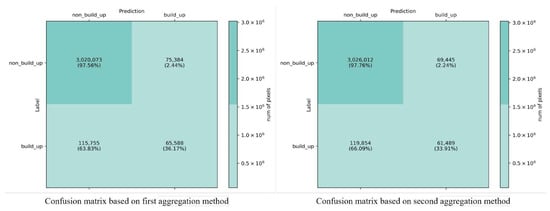 In addition, the confusion matrix was calculated by counting all the images in the testing dataset with the corresponding predictions, as shown in Figure 11. The elements of each position in the confusion matrix represent the number and proportion of pixels. From the confusion matrix, it can be seen that the prediction accuracy of the first aggregation method for built-up areas was 36.17%, which was higher than that of the second method, which was 33.91%; while the prediction accuracy of the second aggregation method for non-built-up areas was 97.76%, which was slightly higher than that of the first method, which was 97.56%. This indicates that the first aggregation method was more advantageous.