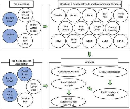 To establish the relationship between pre-fire forest attributes and burn severity, it is essential to explore their connections to the actual expressed severity. Finer spatial resolution forest structure datasets, obtained through CubeSats, UAVs, or LiDAR, are becoming increasingly available as well as the traditional coarser multispectral remotely sensed datasets [22]. Coupled with machine learning classification methods and various resolution datasets, forest structural classification can help explain the variations in burn severity by focusing on pre-fire structural diversity [23].