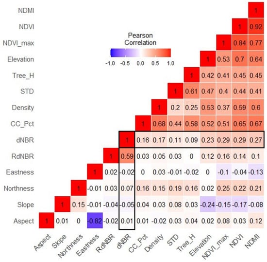 Correlation of all structural and functional variables. Correlations among the topographic and pre-fire vegetation explanatory variables and the two burn severity indices (RdNBR and dNBR), where the dNBR represents a higher correlation coefficient overall.