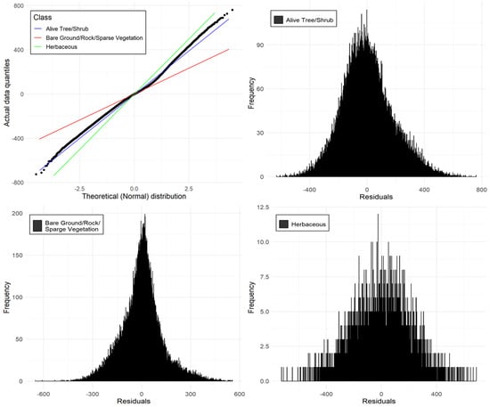 The frequency and spatial distribution of the residual values derived from the regression models were specific to three distinct land cover types (Figure 6 and Figure 7). These residual values elucidate the disparities between the predicted and observed burn severity indices. In Figure 6, the distribution of residual values across all classes demonstrated adherence to a normal distribution, as evidenced by their alignment with the theoretical quantiles. These quantiles were calculated based on the assumed parameters of the distribution such as mean and standard deviation. However, deviations from this expected pattern were observed among the three different land cover classes. The residual values associated with the alive trees and shrubs class exhibited a departure from the expected straight line, indicating a discrepancy between the predicted and observed values. Conversely, the herbaceous class displayed a downward trend, suggesting lighter tails, while the bare ground/rock/sparse vegetation class exhibited an upward trend, indicative of heavier tails.
