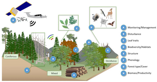 - Biodiversity/Habitats (Figure 2D) is a field closely related to ecology, aiming to use data from RS of forests as a covariate for modelling a species- or taxa-specific habitat within a forest.