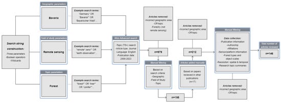 We conducted a literature search using the Web of Science (WoS) platform. Using the advanced search function, we constructed a conditional search string filtered by ‘topic’ with three primary categories: geographic location (Bavaria), topic (forest), and field of study (remote sensing) (Figure 3). Within each category, we used Booleans to specify our search conditions. We also restricted our search to journal articles written in English and the time period from 2000 to 2023. The last date of our article retrieval was 4 January 2024. Therefore, the search period considered all of the articles published within the final year of our review (2023). We utilized so-called ‘wildcards’ (* and ?) to allow for spelling variations. For example, ‘fragment*’ will return results related to ‘fragment’, ‘fragments’, and ‘fragmentation’, while ‘Ha?berge’ would return ‘Hasberge’ or ‘Haßberge’, which is useful for German spellings. Furthermore, some articles were identified from previous reviews and were not captured by our search string. This occurs when the search terms are not contained within the title, abstract, and keywords, but are nevertheless relevant for our review. These articles were added manually after the search results were filtered by abstract and exported from Web of Science. Our final paper selection, therefore, consists only of relevant papers which met our conditional criteria. In the following section, we summarize each parameter of the search string. For reference, the full search string is presented in Table S1 of the Supplementary Materials.