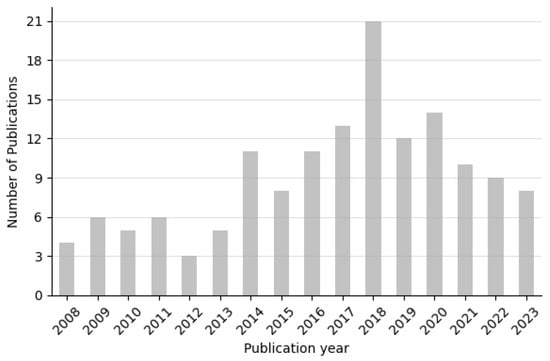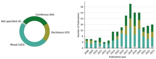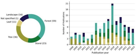 After a review of the relevant abstracts, 195 articles were found to be suitable (matching our topic, geographic region, and field of study) for the thorough review process and were exported. We added 17 additional papers which were identified through other previous reviews of similar topics [11,29]. Finally, we read each article and collected the data presented in this section. Overall, our literature search contained 146 total articles which covered the topic of remote sensing of forests in Bavaria. Because there were no remote sensing studies of forests in Bavaria prior to 2008, this review will present papers published from 2008 onwards. All figures were created using the matplotlib, numpy, pandas, and plotly packages in Jupyter Lab (version 4.0.6) with python (version 3.10.12).