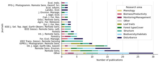 There were 51 unique journals which published the articles examined within this review. Of these, 21 journals published two or more articles and are visualized together with the research topic in detail in Figure 5. The remaining 30 journals published only one article each and have been combined into the category ‘Other’. The most common journals were Remote Sensing followed by Remote Sensing of the Environment and the International Journal of Applied Earth Observation and Geoinformation. Articles published by Remote Sensing covered all topics excluding ‘Biomass/Productivity’ while articles published by Remote Sensing of the Environment excluded this topic in addition to ‘Monitoring/Management’. Articles published by the International Journal of Applied Earth Observation and Geoinformation also excluded ‘Monitoring/Management’ in addition to ‘Biodiversity/Habitats’ and ‘Disturbance’. The remaining journals covered more specific topics. Research areas will be discussed in greater detail in Section 3.8.