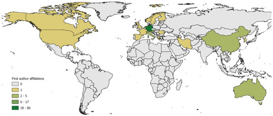First authorships were affiliated with a global distribution of institutes in 21 countries (Figure 6). We summarized the publications from each country based on the number of papers an affiliated first author published. Germany had the highest number of affiliated publications at 86, followed by the Netherlands (17), Austria (8), China, (5), the Czech Republic, Switzerland, and Australia (3), and Italy (2). The remaining countries had one publication each from affiliated first authors; these are summarized in Table 2.