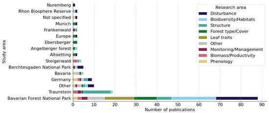 There are seven administrative regions (Regierungsbezirke) in the free state of Bavaria. Forest cover, species composition, and management schemes differ in each region. There were 18 unique study sites within Bavaria (Figure 7). The most commonly studied area of interest (AOI) was the Bavarian Forest National Park (BFNP), which was the location of 88 studies in our review. The Traunstein forest, which is part of the global ForestGEO network, was the second most popular AOI with 19 studies, followed by Berchtesgaden National Park, which was the AOI for five papers in our review, while the Steigerwald forest was the AOI in four studies. The following AOIs were investigated in two or fewer papers: Rhon Biosphere Reserve (2), Frankenwald (2), Angelberger forest (2), Munich (2), Altoetting (2), Ebersberger (2), Coburg (1), Spessart (1), Nuremburg (1), Freisinger (1), Passau/Freyung-Grafenau (1), Landsberg (1), Kaufbeuren (1), Kranzberg forest (1), and Taubenberg (1). The entire state of Bavaria was covered by five studies, while the whole of Germany and Europe (where AOIs were located within Bavaria) were investigated in nine and two papers, respectively, with two studies not specifying an AOI. In terms of the overall number of studies and unique AOI locations, 89 studies within two AOIs were located in Lower Bavaria (Niederbayern), 34 studies among 9 AOIs were located in Upper Bavaria (Oberbayern), 5 studies within two AOIs were located in Middle Franconia (Mittelfranken), and 3 studies among two AOIs were located in Upper Franconia (Oberfranken), Lower Franconia (Unterfranken), and Swabia (Schwaben), while no studies were conducted in Upper Palatinate (Oberpfalz).