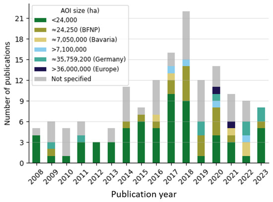 The BFNP covers approximately 25,000 hectares and is located on the border of Germany and the Czech Republic in southeastern Bavaria. About half of the studies in this review constituted AOIs smaller than the BFNP, with five papers focused on the entire state of Bavaria; nine and two studies covered Germany and Europe, respectively. Most of the studies which were smaller than the overall size of the BFNP nevertheless took place within the BFNP. Throughout the study period, many studies did not specify the AOI size, and while there is a slight increase in larger more regional study AOIs over time, more than half of studies in 2023 were in AOIs smaller than the BFNP (Figure 9).