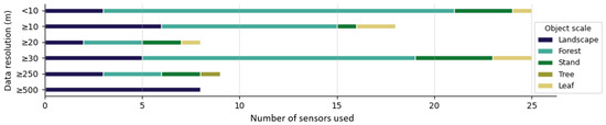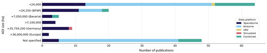 Among studies with known AOI sizes, the data platform selection tends to be related to the size of the study area (Figure 10). Airborne data tend to have a higher spatial resolution and lower temporal resolution and thus lends itself toward studies of a smaller spatial scale. For example, the BFNP in partnership with the German Aerospace Center (DLR) conducts flight campaigns to collect airborne high-spatial-resolution data, which are often used in RS studies of the park. Therefore, most of the AOIs which are smaller than the BFNP utilize airborne data. Studies which covered the whole of the BFNP utilized airborne and spaceborne data in nearly equal amounts. Conversely, spaceborne data, while less commonly used in smaller spatial scale studies, are used exclusively in studies investigating forests at the spatial scale of Bavaria or larger. Most of the studies which did not specify an AOI size used airborne data. There was one study which utilized UAV data and one study which created a dataset of simulated lidar points over the whole of Bavaria.