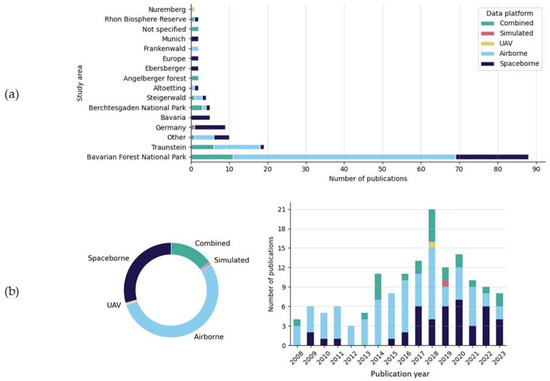 We found that six AOIs were investigated using data both from spaceborne and airborne platforms, while one study utilized a simulated lidar dataset which covered the spatial extent of Germany and one study utilized UAV data for a study site outside of Nuremberg. (Figure 11a). Although airborne data have been predominantly used to investigate forests in Bavaria, particularly in the BFNP, over time more spaceborne data and studies which utilized data types used in combination tended to increase over time (Figure 11b). In the last two years (2022 and 2023), spaceborne data were used in more than half of these publications. The category of ‘combined’ data types refers to spaceborne and airborne used together within the same study. The highest number of publications utilizing combined data was in 2018.