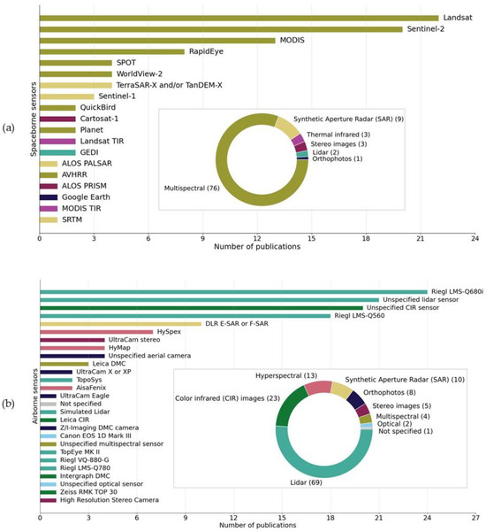 Sensor type varied by data platform. Among spaceborne sensors, multispectral data were predominantly used, specifically those from Landsat (22 studies) and Sentinel (20 studies) (Figure 12a). MODIS was utilized in 13 studies, while RapidEye, SPOT, WorldView-2, QuickBird, Planet, and AVHRR data were used by fewer studies. Synthetic Aperture Radar (SAR) data were used in 9 studies, mostly from TerraSAR-X and/or TanDEM-X. The remaining data types, namely stereo images, thermal infrared, lidar, and orthophotos, were used in three or fewer papers.