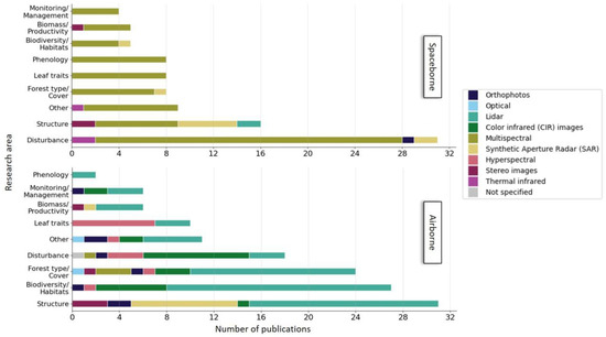 Among the studies conducted using airborne data, the data type had a higher variation within the topic investigated. Three topics (‘Disturbance’, ‘Forest type/Cover’, and ‘Structure’) were investigated using six different types of data, while ‘Phenology’ was investigated using a combination of airborne lidar and spaceborne multispectral data in two publications. The topic of ‘Leaf traits’ was investigated mostly with hyperspectral data among users of airborne-derived data, while the same topic was investigated with multispectral data among studies conducted with spaceborne data. It is important to note that 18 publications utilized data from more than one spaceborne sensor and 26 publications utilized data from more than one airborne sensor in the same study. Figure 11 details the usage of combined sensors and platforms.