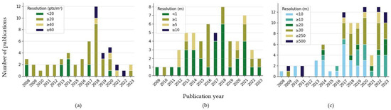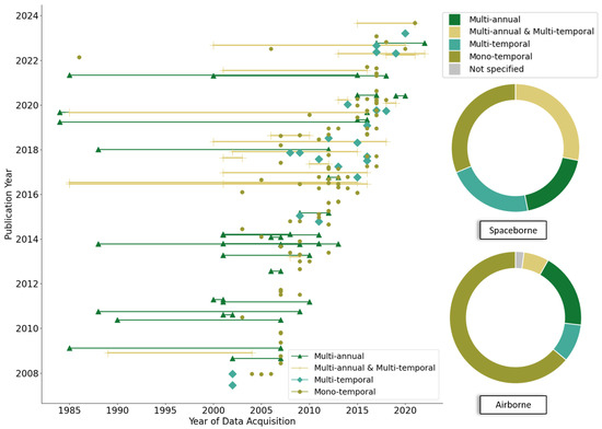There were four temporal resolutions utilized by investigators in this review. Mono-temporal studies used data from a single acquisition, whereas multi-temporal studies utilized multiple acquisitions within the same year. Multi-annual studies acquired data once per year for more than one year, while multi-annual and multi-temporal studies utilized data which were acquired multiple times a year over the course of two or more years. The four resolutions were utilized relatively equally among spaceborne data types, while mono-temporal data acquisitions were used predominantly among airborne data users (Figure 14). There was a relatively even distribution of mono-temporal and multi-annual studies throughout the study period. However, the trend for studies which used data either multi-temporally or multi-annually and multi-temporally has increased in the years since 2017, with relatively few in the early part of the study period.
