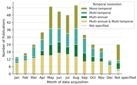 In terms of monthly data acquisitions, investigators selected data within the growing season predominantly, i.e., May–August (Figure 15). However, studies which acquired data for multi-annual and multi-temporal studies also utilized more data relatively evenly throughout the leaf-off months as well (January–April and September–December). Although most studies accounted for temporal resolution within the Methodology section, 24 studies did not specify during which months the RS data were acquired.