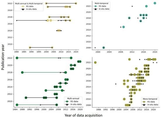 Here, we present ground-based data based on temporal resolution and exclude all studies which either did not utilize in situ data or where the so-called in situ data were acquired from an airborne platform (Figure 16). Although many studies have utilized overlapping datasets, there are some which do not coincide temporally. This suggests a potential mismatch in the RS and in situ data. There is no clear trend as to which type of temporal resolution acquired more or less contemporaneous in situ data than others.