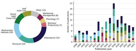 RS investigations of forests in Bavaria began in 2008. Until 2014, there were fewer than ten papers published each year. Publications increased steadily until 2018, the year with the highest number of papers published (n = 21). After 2018, we saw a decreasing trend with a small increase in 2020 and a decreasing number of papers in the years afterwards (Figure 4). In 2023, eight papers were published.