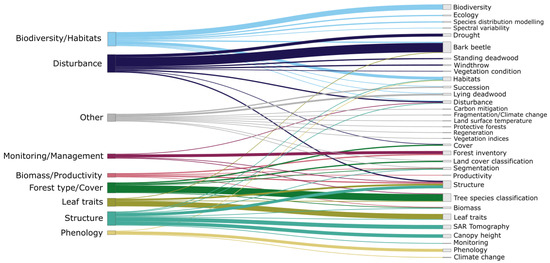 Within the ‘geographic location’ category, the search terms included the German federal state of Bavaria. In order to capture as many relevant articles as possible, we also included increasing and decreasing spatial scales in case of studies conducted at the national or continental level which covered Bavaria, and by the same token, smaller-scale studies within Bavaria that might only include local geographic names such as parks or reserves. To ensure this, we included names of all national parks, biosphere reserves, nature reserves, and ForestGEO sites in Bavaria. The ‘remote sensing’ field of study category was constructed to capture any study utilizing satellite, airborne, or unmanned aerial vehicle (UAV) studies. We did not included studies which solely relied on terrestrial laser scanning (TLS) as a data source. Finally, the ‘topic’ category focused on forests. In order to capture more articles, we also included species-specific and forest type terms in our search.