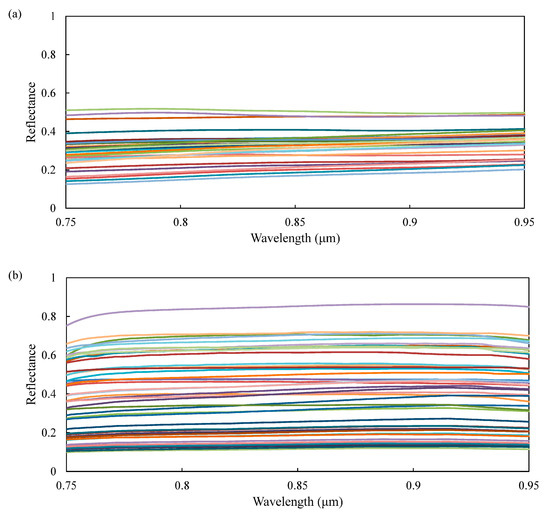 The data of the 865 nm band of the POSP is used for radiometric calibration of the 865 nm band of the DPC. Due to the fact that the SRFs of the bands at 865 nm for the DPC and POSP are not completely consistent, it is necessary to determine the conversion relationship between the observation data of these two bands before radiometric calibration. In this study, we first use spectral data from typical ground objects (such as rocks, vegetation, and bare soil) and the SRFs of POSP and DPC to determine the surface reflectance of these two bands under different conditions. For any spectral curve (referred to as curve X), the surface reflectance of any band of either the DPC or POSP (referred to as band X) can be calculated using Equation (1) [17]. The spectral reflectance data used are illustrated in Figure 3 [18].