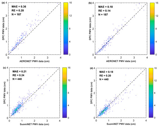 The validation results based on the AERONET PWV data show that the relative error (RE) and mean absolute error (MAE) for the DPC PWV data developed using data before calibration (referred to as data M1) are 0.28 and 0.36 cm, respectively; the RE and MAE for the DPC PWV data developed using the data after recalibration (referred to as data M2) are 0.14 and 0.18 cm, respectively. Data M2 exhibited a reduction of about 50% in both the MAE and RE compared to data M1. The validation results based on SuomiNET PWV data show that the RE and MAE for data M1 are 0.24 and 0.21 cm, respectively; the RE and MAE for data M2 are 0.20 and 0.18 cm, respectively. Compared with data M1, data M2 show a 17% decrease in the RE, and a 14% decrease in the MAE. The validation results based on both the SuomiNET PWV data and AERONET PWV data show that the RE and MAE for data M1 are 0.25 and 0.26 cm, respectively; the RE and MAE for data M2 are 0.18 and 0.18 cm, respectively. Compared with data M1, data M2 show a 28% decrease in the RE, and a 31% decrease in the MAE. For ease of description, the accuracy improvement of data M2 relative to data M1 is abbreviated as AI21. Due to the calibration model used for DPC being constructed based on the AERONET PWV data and the difference between the SuomiNET PWV data and AERONET PWV data [19], it is reasonable that the AI21 calculated based on the SuomiNET PWV data is worse than the AI21 calculated based on the AERONET PWV data. However, regardless of whether the AERONET PWV data or the SuomiNET PWV data are used as reference data, the accuracy of data M2 is significantly superior to that of data M1.