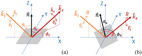 We assume that the mean surface orientation associated with sloped terrain is known. Its determination—for example, from DEM data—is beyond the scope of this work. In this case, and are deterministic variables, and, using the polarization rotation matrices, we can convert the measurement effectively to the case of a horizontal rough surface. Hence, without loss of generality, we will limit our study to the horizontal surface geometry.