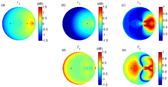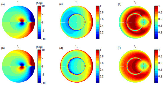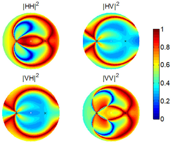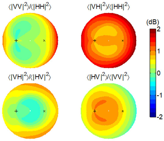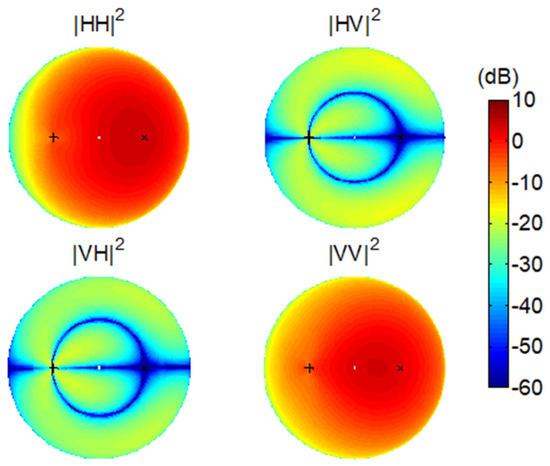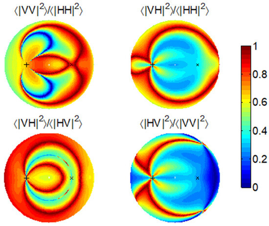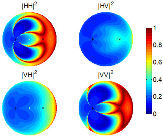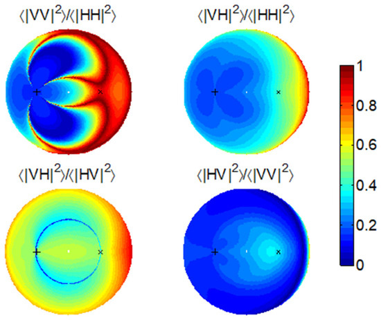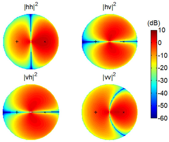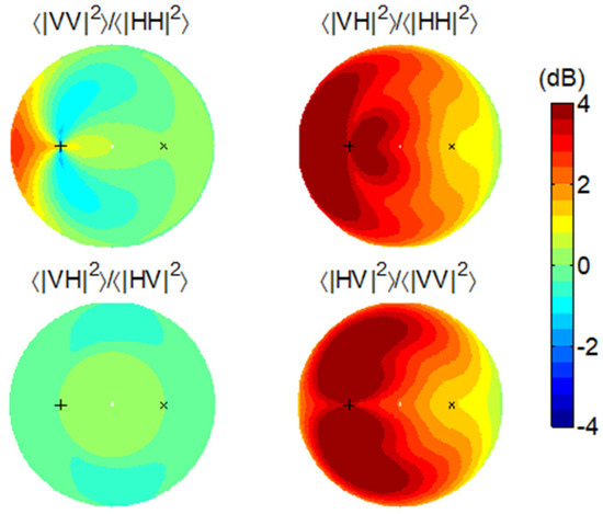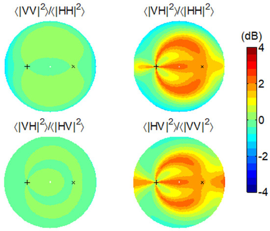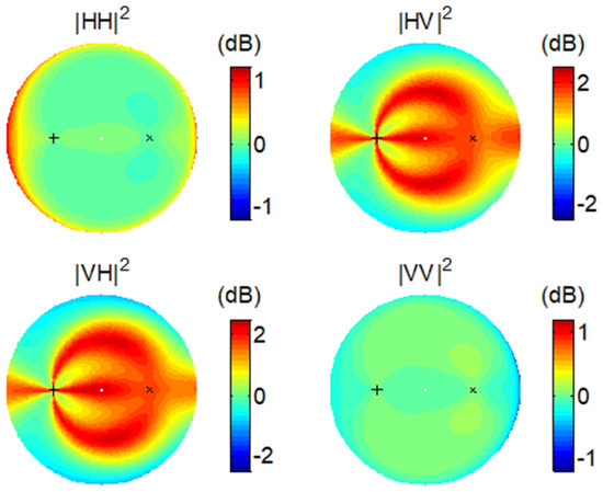 Co-polarization and cross-polarization are clearly defined in the monostatic scenario. However, a systematic polarization difference is always contained in the bistatic scenario. As demonstrated in Figure 1a, , except in the backscattering direction, and differs from by an angle of . When , and are in fact orthogonal. Figure 2 shows a typical set of bistatic scattering intensities from a horizontal surface in the four polarization channels using the SPM. We fix the incidence direction but vary the scattering direction () in the full upper hemisphere (also refer to [21] for the detailed simulation settings). We can see that the HH channel reaches minima in the cross-plane of the incidence where both the VH and HV channels are strong. Coincidently, the two horizontal states in the transmitter and the receiver are orthogonal.