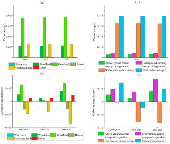 Changes in carbon storage in the Yellow River Basin of various land use types and carbon pools from 2000 to 2020. (a,b) Carbon storage of land use type, (c,d) changes in carbon storage in land use type.