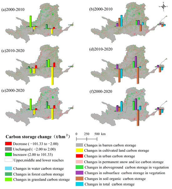 From 2000 to 2020, the total amount of carbon stored in the YRB did not vary in response to changes in space, with increasing and decreasing areas staggered (Figure S3). Carbon-storage-increasing areas were mostly centered in the upper reaches’ western region from Lanzhou to Hekou Town, and some areas in the middle stream from Hekou Town to Longmen, and decreasing areas were mainly distributed around the provincial capital cities. Influenced by LUCC, carbon storage showed opposite trends in different periods. The area wherein carbon storage changed in 2000–2020 was smaller compared to the two subperiods (2000–2010, 2010–2020). Between 2000 and 2020, the percentage of carbon storage that decreased (2.13%) was marginally less than the percentage of carbon storage that increased (2.48%).