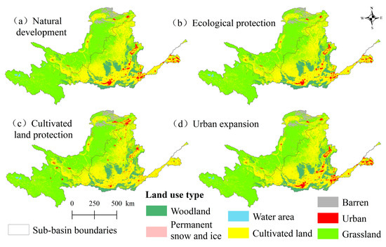 There were notable differences in the distribution and quantitative changes in land use categories under the different scenarios in the upper, middle and downstream sections of the YRB (Figure S4). In all four scenarios, there was a downward trend in the upstream cultivated land area, an upward trend in the midstream cultivated land area under the natural development and cultivated land protection scenarios and only an upward trend in the downstream agricultural area under the cultivated land protection scenario. While the middle and downstream grassland regions showed a declining tendency under all four scenarios, the upstream grassland area showed a drop only under the cultivated land conservation scenario. The upstream urban area increased only in the case of farmland protection, and midstream and downstream urban areas decreased under the cultivated land protection scenario.
