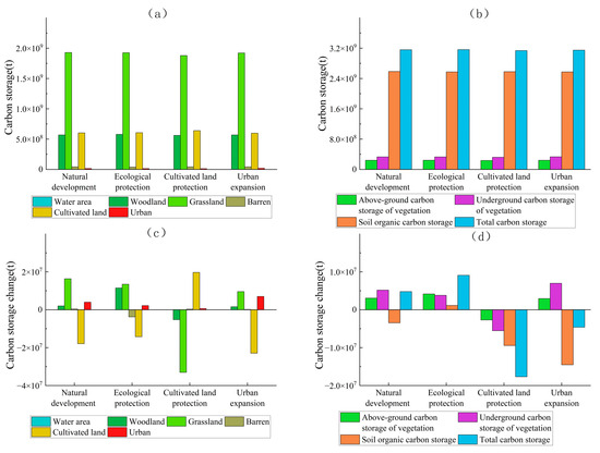 Carbon storage and changes in land use and carbon pools in the Yellow River Basin under different future scenarios. (a,b) Carbon storage of land use type, (c,d) changes of carbon storage in land use type.