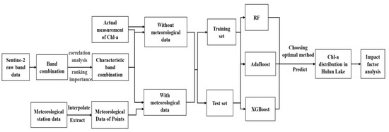 - In this study, meteorological factors were used as auxiliary variables combined with the Sentinel-2 remote sensing reflection band combination as the input variables, and three machine learning algorithms were used to establish the Hulun Lake Chl-a simulation model. The outcomes demonstrate that the model’s precision increased with the addition of auxiliary variables. The RF, AdaBoost, and XGBoost models’ R2 saw increases in the precision of 7.25%, 5.71%, and 7.20% to 0.76, 0.73, and 0.66, respectively. Furthermore, there was some improvement in the precision of both the MAE and RMSE;