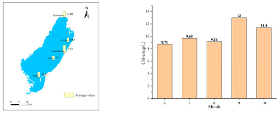 Based on the available measured sample point data, we plotted the mean Chl-a concentration at each sample point from June to October, spanning 2016 to 2021, and the multi-year monthly mean concentrations at five sample points (Figure 3). The results show that among the five sample points, the concentration values at two sample points located at the edge of the lake were relatively high, 14.4 µg/L and 11.28 µg/L, for Ganzhuhua and Xiaohekou, respectively, while the concentration values at the other three sample points were relatively low, with Chuhu, Ruhu, and Huxin at 10.22, 8.63, and 7.70 µg/L, respectively. The monthly mean concentration for the five sample sites was highest in September at 13 µg/L, followed by October at 11.4 µg/L, and lowest in June at 8.71 µg/L.