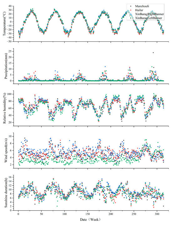 Weekly average values of temperature, precipitation, relative humidity, wind speed, and sunshine duration at four meteorological stations from 2016 to 2021.