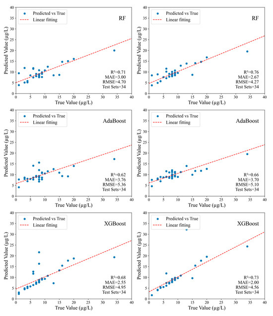 According to the comparison diagram (Figure 5), the RF model showed the highest performance among the three machine learning models when no meteorological data were included, with an R2 of 0.708, MAE of 2.999 µg/L, and RMSE of 4.703 µg/L. In contrast, the AdaBoost model had the lowest performance, with an R2 of 0.621, MAE of 3.759 µg/L, and RMSE of 5.099 µg/L on the test set. The meteorological data integration enhanced the precision of the test sets for the three machine learning models. The R2 of the three machine learning models increased by 0.051, 0.035, and 0.049, respectively. The enhanced precision levels were 7.25%, 5.71%, and 7.20%. Following the enhancement, RF’s R2 was 0.759, the highest among the models, while AdaBoost had the lowest precision with an R2 of 0.657. In addition, the precision of the MAE and RMSE were improved to different degrees, which means that the performance effect of the machine learning model was enhanced to a certain extent after the meteorological data auxiliary variables were added.