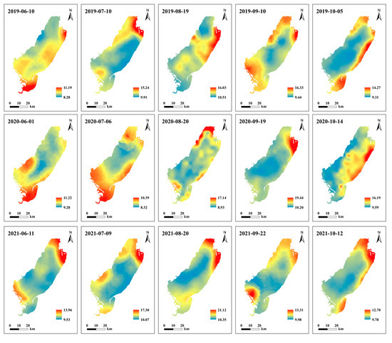 According to Figure 8, in 2019, the Chl-a concentration in Hulun Lake followed an upward trend initially, reaching its highest in September at 12.11 µg/L, and subsequently fell. The lowest concentration was recorded in June at 9.39 µg/L, as shown in Figure 8. In 2020, the Chl-a concentration showed a slight change, reaching its highest average value of 11.62 µg/L in September and lowest of 9.35 µg/L in July. In 2021, Chl-a levels followed a similar pattern as in 2019. The average value reached its peak in August at 13.00 µg/L, and the lowest in June was 10.65 µg/L. The Chl-a concentration in Hulun Lake during non-ice periods typically followed an increasing trend, peaking in August. Algal blooms in the lake usually occur in July and August, aligning with peak Chl-a concentration.