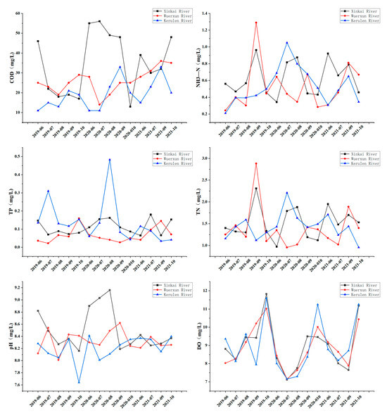 The river flowing into the lake serves as a vital conduit for energy transfer between the lake and its surroundings, and the nutrients brought by the river play a significant role in stimulating algal growth. We noticed that the southwest and northeast parts of the lake are located near the three rivers that flow into the lake: the Xinkai River, Urxun River, and Krulun River. Figure 7 displays the variations in six key water quality parameters (pH, DO, COD, NH3-N, TN, and TP) of the three rivers that flow into the lake from June to October, spanning 2019 to 2021. The results indicate that the chemical oxygen demand (COD) levels of the three rivers flowing into the lake are high, with average values of 30.62, 25.73, and 17.24 mg/L, respectively. Compared to the surface water quality level (Table 3), the Xinkai River has a COD concentration level classified as Class V, indicating the highest degree of pollution. The Urxun River is classified as Class IV, whereas the Krulun River is classified as Class III. The overall nitrogen concentration in the three rivers was around 1.5 mg/L, meeting Class V standards. The average TP concentrations were 0.09, 0.06, and 0.12 mg/L, respectively, with TP levels in the Krulun River surpassing Class III standards. The NH3-N concentrations in all three rivers exceeded 0.5 mg, reaching Class III limits. Higher nutrient levels were an important factor in the frequent occurrence of high-value regions of Chl-a concentration near the three inlets.