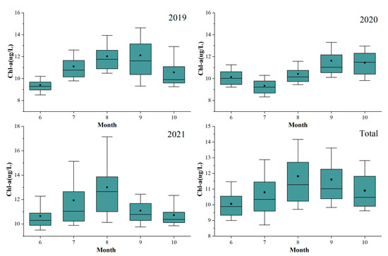 Hulun Lake Chl-a concentration monthly change box diagram from June to October. (The center line of the box represents the median value; the dots represent the average value; the bottom and top of the box represent the upper and lower quartiles, respectively; and the bottom and top lines represent the 10th and 90th percentiles, respectively.)