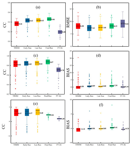 Box charts showing the evaluation results for five satellite precipitation products: (a) the results of CC at daily scale; (b) the results of RMSE at daily scale; (c) the results of CC at monthly scale; (d) the results of RB at monthly scale; (e) the results of CC at annual scale; (f) the results of RB at annual scale. The different boxes in the figure represent different satellite precipitation products. CC: correlation coefficient; RMSE: root mean square error; RB: relative bias.