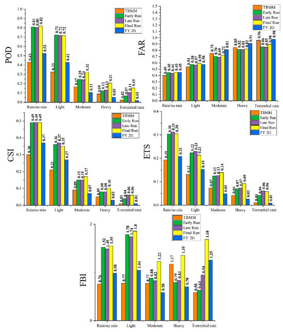 To further evaluate the impact of different precipitation levels on SPP performance, five indicators (POD, FAR, CSI, ETS, and FBI) were used to evaluate the threshold values of 0.1, 10, 25, and 50 mm/d, which delimit “rain/no rain”, “light rain”, “moderate rain”, “heavy rain”, and “torrential rain” conditions (Figure 4). All of the SPPs show the best detection ability for “rain/no rain” conditions, and the detection ability decreases with an increase in the rainfall level. The GPM Final Run shows the strongest detection ability, with the POD of “rain/no rain” conditions reaching 0.82. However, it tends to overestimate rainfall across different intensities based on the frequency deviation. The GPM Late and Early Runs show the second highest detection abilities. In their case, the “rain/no rain” and “light rain” conditions are overestimated to a certain extent, whereas “moderate rain”, “heavy rain”, and “torrential rain” are underestimated. This indicates greater uncertainty in the detection of extreme precipitation and micro-precipitation using GPM products [46]. FY-2G shows the next-best detection capability. According to the FBI (FBI > 1: overestimate; FBI < 1: underestimate), in contrast to GPM IMERG, FY-2G tends to underestimate low-precipitation events in the form of drizzle, moderate rain, and heavy rain, but overestimates light rain and torrential rain. In addition, FY-2G commonly produces underreporting of precipitation events because the satellites typically use the bright temperature data of the infrared channel to invert precipitation while ignoring the influence of albedo information in the visible channel on precipitation, which results in a certain degree of detection error. Our results indicate that TRMM 3B42RT has low applicability at a high altitude and for complex terrains in the Lancang River Basin and can easily overestimate rainfall of a larger magnitude while underestimating rainfall of a smaller magnitude.