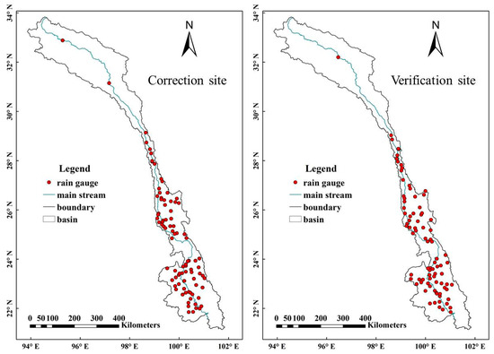 After comprehensively considering the applicability of various SPPS to the Lancang River Basin, we selected the three types of GPM IMERG products and FY-2G for subsequent correction. We selected a period from 1 January 2020 to 31 December 2020 and a daily time scale. First, 176 ground observation stations in the Lancang River Basin were divided into a “correction group” and “verification group”, with 88 stations in each group (Figure 5). Precipitation observations from the ground stations in the “correction group” were used to revise the satellite precipitation data, whereas the “verification group” was used to evaluate the correction effect of the window sliding method.