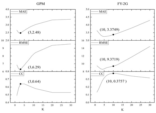 Second, we proposed a novel window sliding correction method that considers the spatial distribution of precipitation data. To improve the data correction effect, we determined the optimal window widths for the GPM and FY-2G products. The selection process is illustrated in Figure 6. For GPM IMERG, the optimal performance is achieved when the window side length is three grid units, yielding the highest CC and low error indexes. Conversely, for FY-2G, the best correction effect is attained when the side length of the correction window is 10 grid units, resulting in the highest CC and reduced RMSE and mean absolute error (MAE) values. Therefore, we selected three and ten grid units as the corrected window side lengths for GPM IMERG and FY-2G.