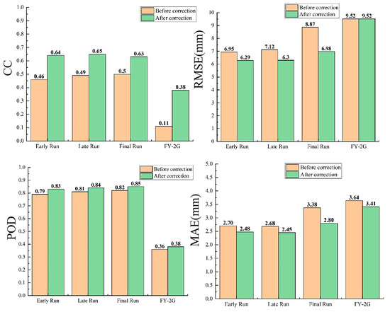 In this study, the CC, RMSE, POD, and MAE were used to evaluate the correction effects in various SPPs (Figure 7). In the Lancang River Basin, the proposed window sliding correction method improves the CC and precipitation detection ability (POD) and reduces the errors (RMSE and MAE) of the SPPs. It is worth mentioning that the correction method leads to the greatest CC improvement for FY-2G. GPM IMERG shows a large reduction in both error indicators, most obviously in the Final Run product. However, the four SPPs showed a low distinction in detection performance (POD) after the correction.