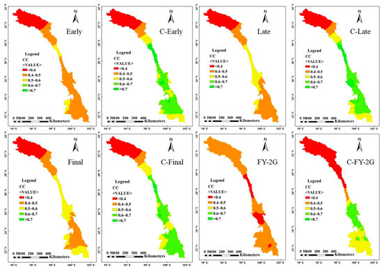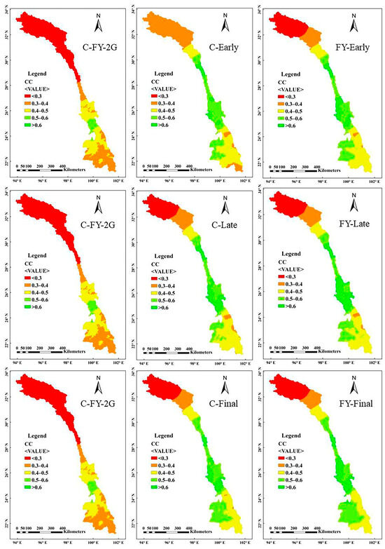 To further improve the data quality, we performed fusion based on the previous correction procedure. Figure 9 depicts the spatial distribution characteristics of the CC for the datasets before and after fusion (in which, for example, C-FY-2G represents the evaluation result of FY-2G after the correction, C-Early represents the evaluation result of the Early Run after the correction, and FY-Early represents the evaluation results of the revised FY-2G and Early Run fusion dataset). The Bayesian fusion method improves data quality and generates a more precise dataset. Similar to the conclusions of Wanders et al. [48], data fusion can reduce precipitation uncertainty. In addition, the fusion datasets obtained in this study exhibit high CC values in the middle and lower reaches of the Lancang River, indicating a better ability to reflect the precipitation characteristics of the region, but with less ideal CC values in the upper reaches. This is attributed to the relatively complex precipitation, influenced by climate, terrain, and other factors, the low accuracy of the original data in areas with few ground observation stations, and the relative lack of ground-measured reference data. Thus, the applicability of the Bayesian fusion method in this region requires further study.