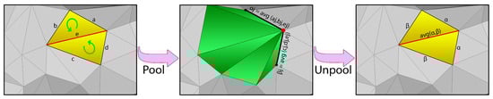 Adjacency is implicit when pooling on regular imagery data, therefore the kernel size selection immediately determines the pooling area. The new adjacency is again intrinsically specified since characteristics in each area are combined, such as max or average, to produce an equally distributed grid space. The traditional pooling in images already has unfolded its generalization ability in many 2D computer vision tasks. Another unique use of generalized pooling is mesh pooling, in which adjacency depends on the underlying mesh topology. In contrast to images, where pooling often has a natural reduction factor of 4, several edge collapse dispositions are needed for standard mesh pooling. In our settings, each of these edge collapse operations among five targeted edges will transform into two edges with the assistance of LKA. Every pooling process enables to direct the network to acquire the required mesh depth by adding an LKA-based hyperparameter that indicates the array of objective edges in the final mesh. According to [49], to obtain mesh adjacency information during runtime, certain data structures that are recurrent must be accessed and updated.