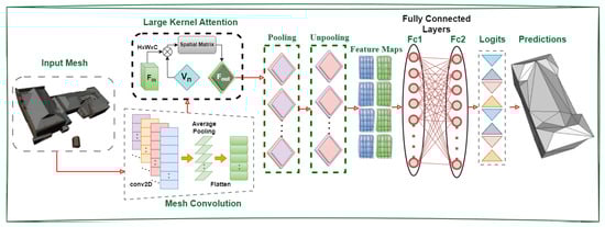 is the input feature in this case. stands for attention map. Each feature’s relevance is indicated by its value in the attention map. ⊗ indicates element-wise product. Unlike sigmoid and softmax, which are typical attention strategies, LKA does not need an extra normalizing function [48]. Additionally, we think that adaptively modifying output depending on input feature—rather than the normalized attention map—is one of the primary attributes of attention approaches. The LKA that Guo et al. [48] suggested combines the benefits of self-attention and convolution. It considers the broad receptive field, linear complexity, dynamic process, and local contextual information. LKA further accomplishes flexibility in the channel dimension along with the spatial dimension. It is noteworthy that in deep neural networks, distinct channels often represent distinct objects as explained by Guo et al. [35], and that flexibility in the channel dimension is crucial for tasks involving 3D meshes (refer to Figure 2).
