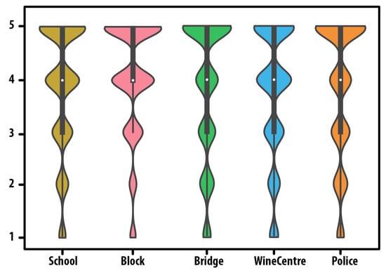 Distributions of evaluation scores on the five classes (black lines: Quartiles, while points: Medians).