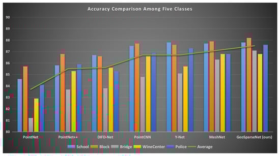 Among various structures and classes in the Adelaide Dataset, five classes are shown below for comparisons. The green curve in Figure 5 and the last column in the Table 2, represent average values. GeoSparseNet highlights its enhanced performance by demonstrating a discernible rise in accuracy across all classes.